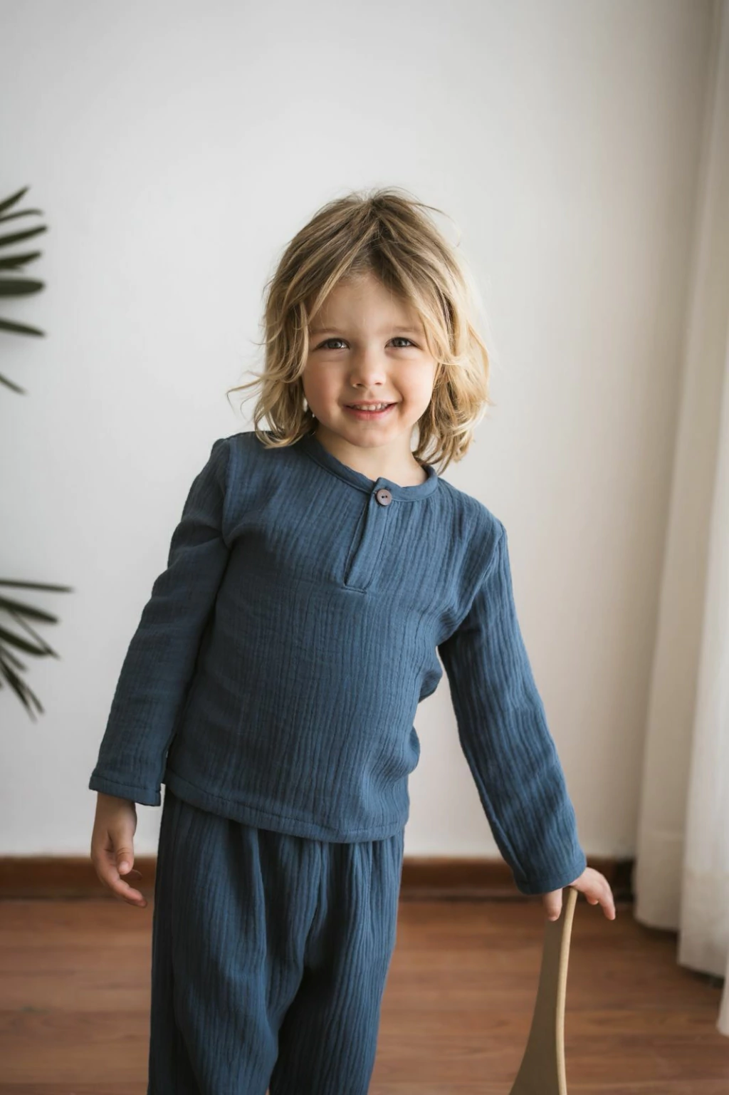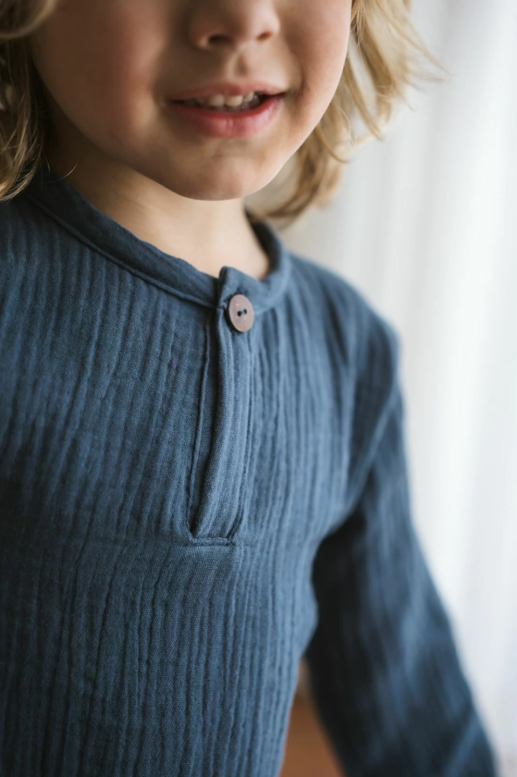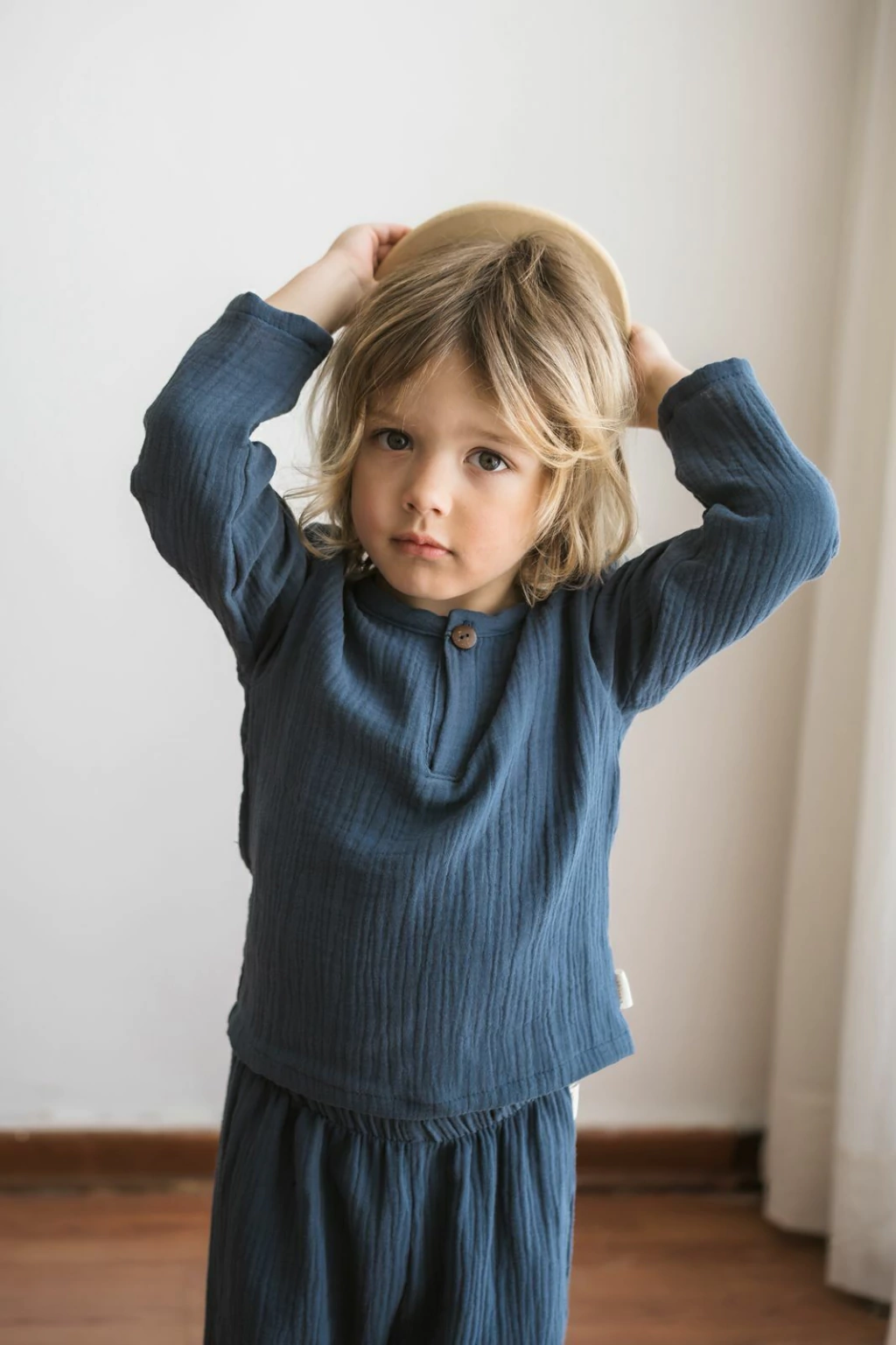 Hecha en doble algodón azul, esta remera manga larga es ideal para los días frescos.