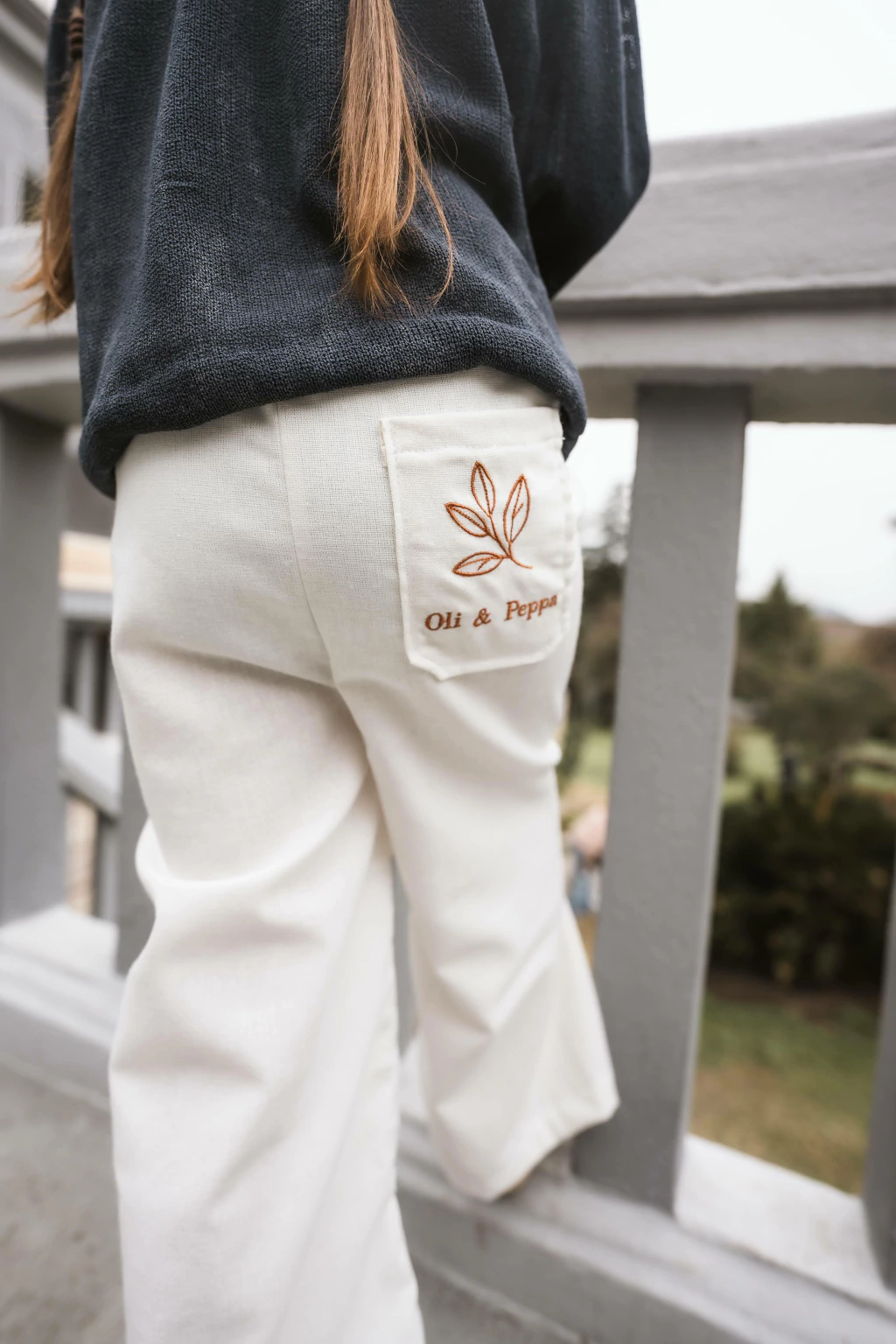 En la parte trasera, un delicado bolsillo con el logo y nombre Oli & Peppa bordado en tono marrón aporta ese toque artesanal y distintivo de nuestra marca.