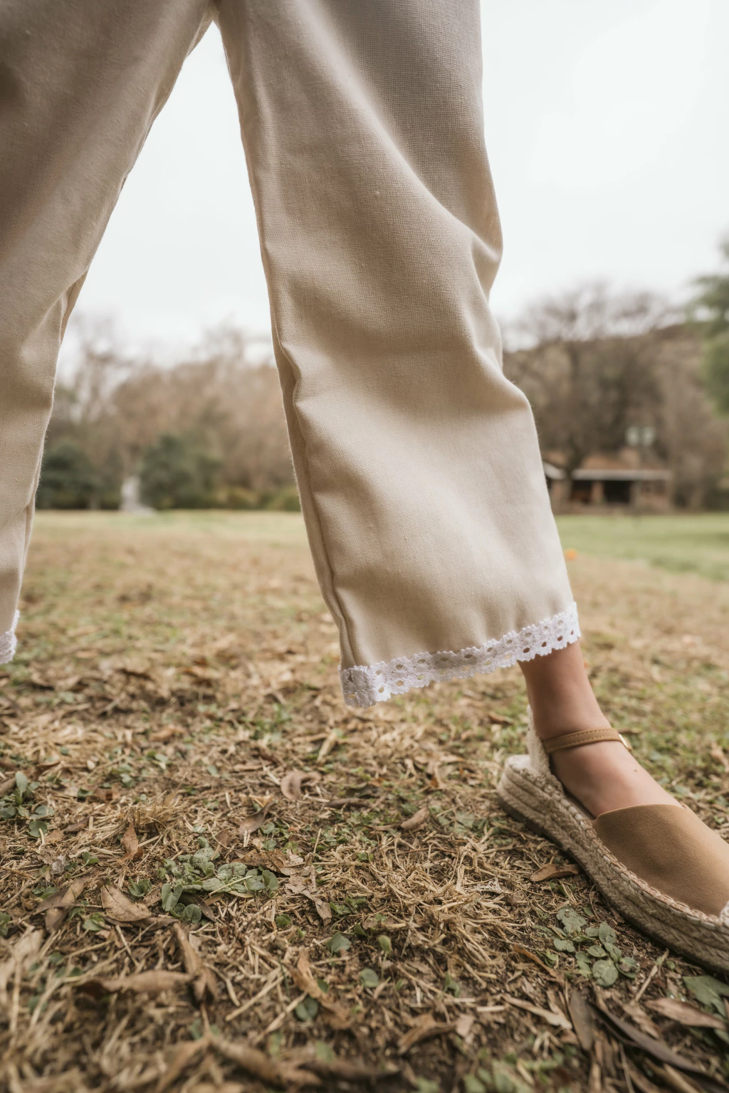 La puntilla en el ruedo le aporta un toque romántico y artesanal, manteniendo una silueta suelta y ligera.