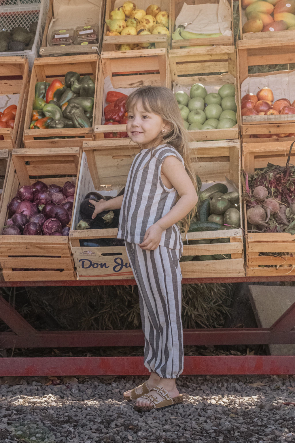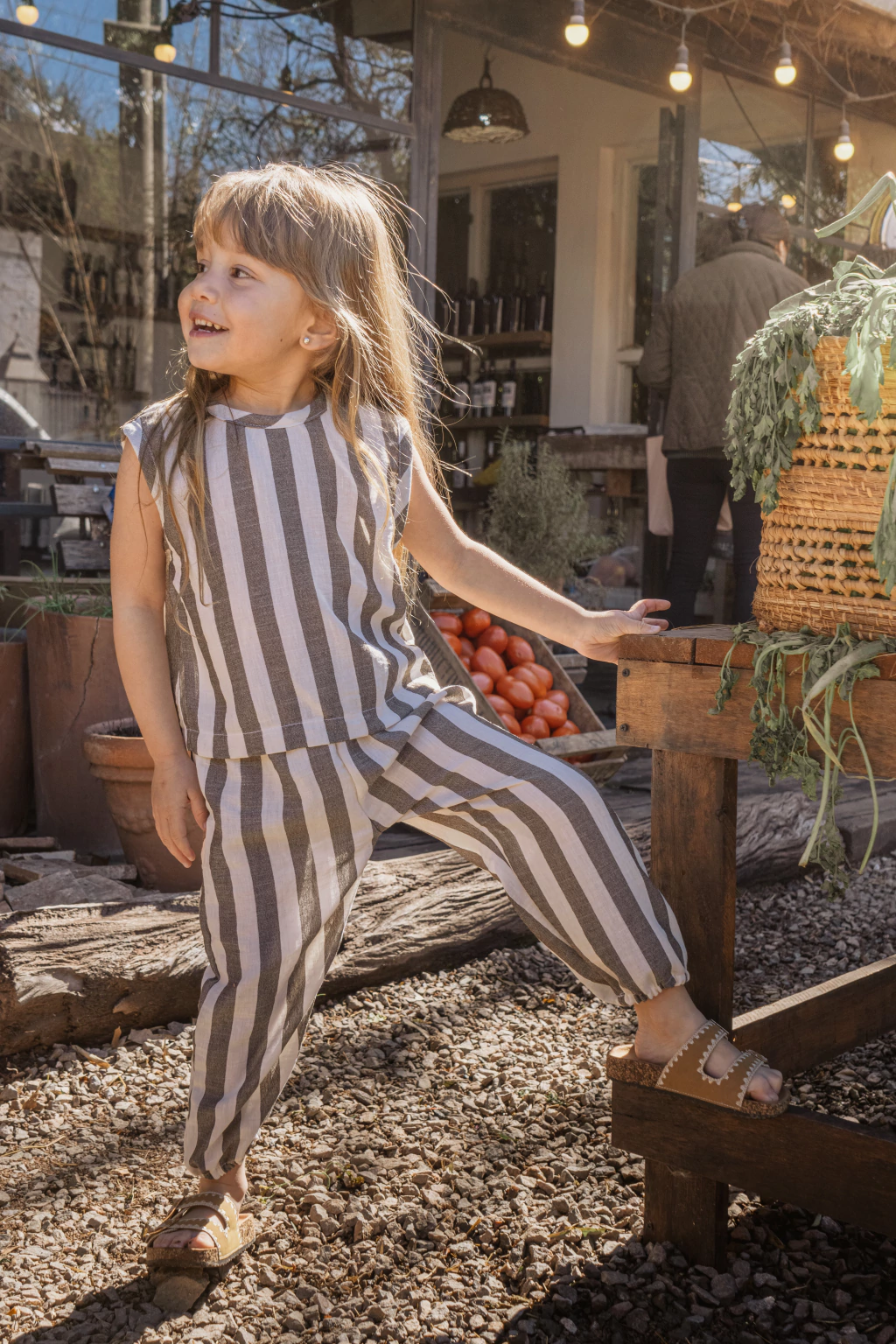 Pantalón de lino con rayas anchas en tonos neutros, de calce relajado y textura liviana.
