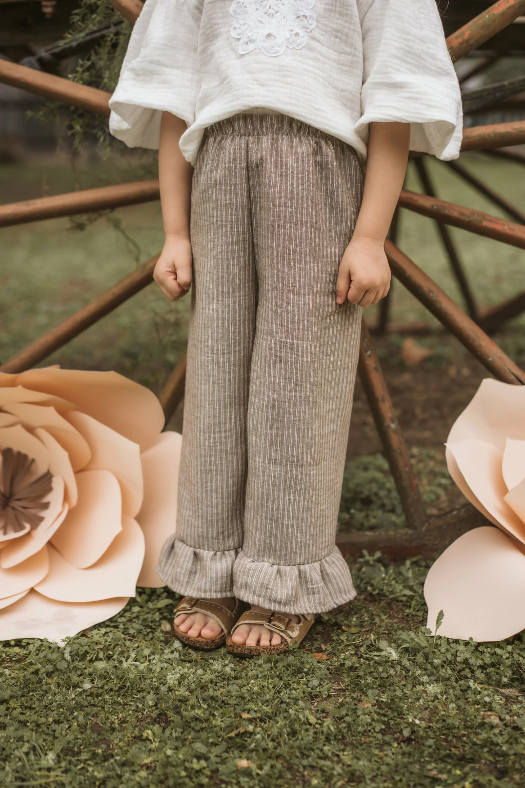 Confeccionado en lino rayado blanco y chocolate, este pantalón ancho combina movimiento y suavidad.